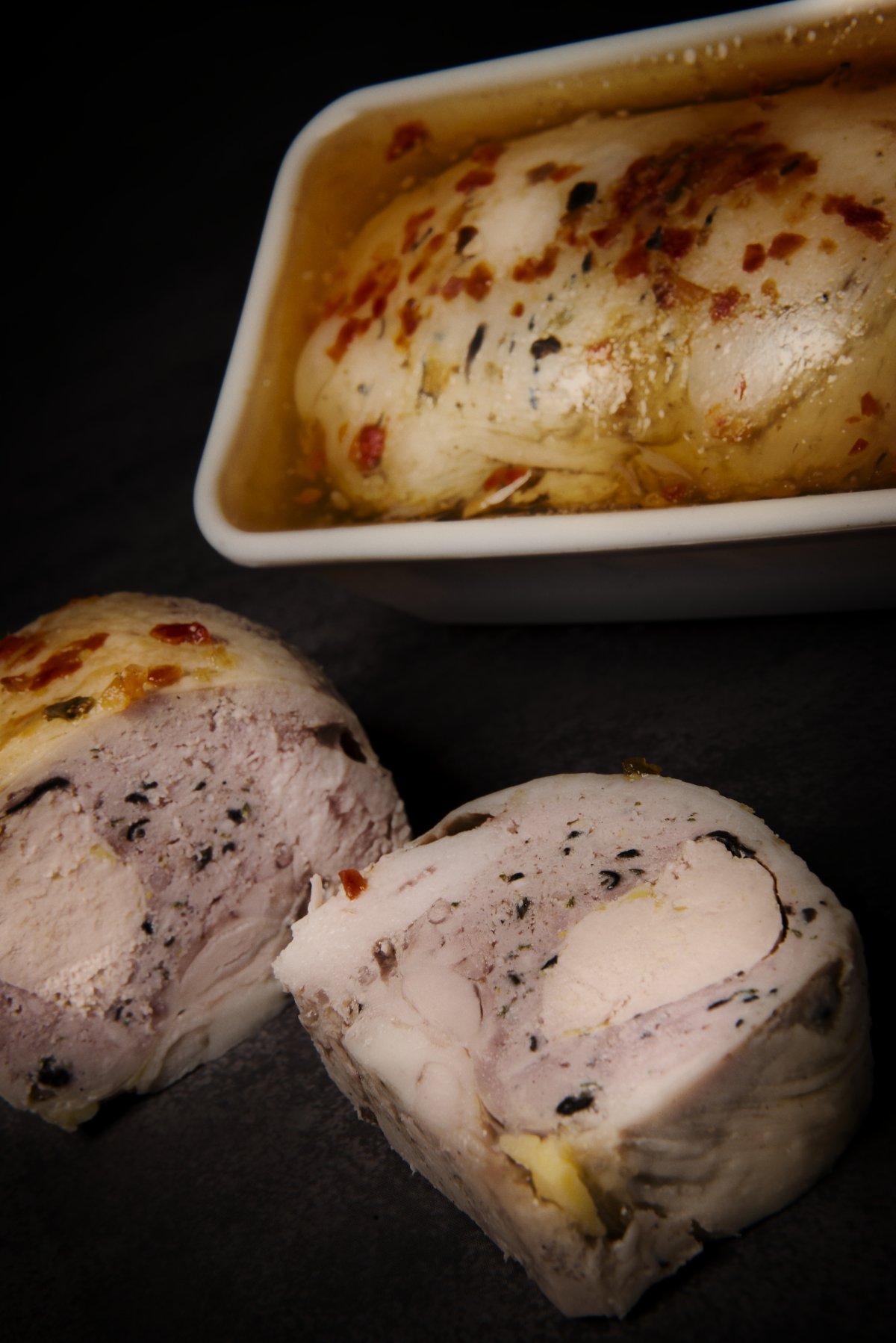 Ballotine de caille farcie veau & Volaille, pistache, corne d'abondance (champignons noirs), Porto et coeur farcie foie gras de canard