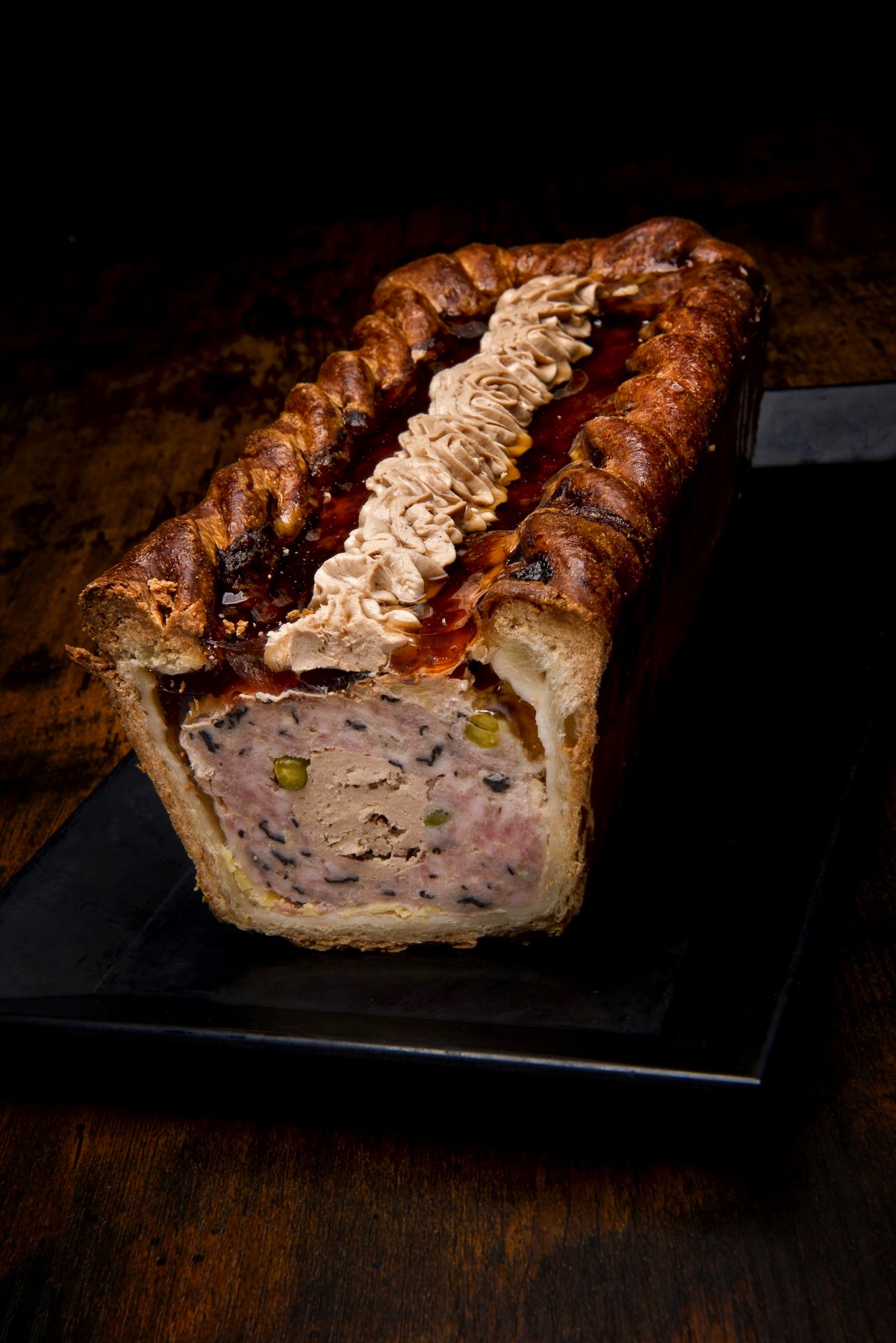 Terrine de porc hachée montée par étage: foie gras de canard entreposé entre chaque épaisseur avec une petite touche de truffe.